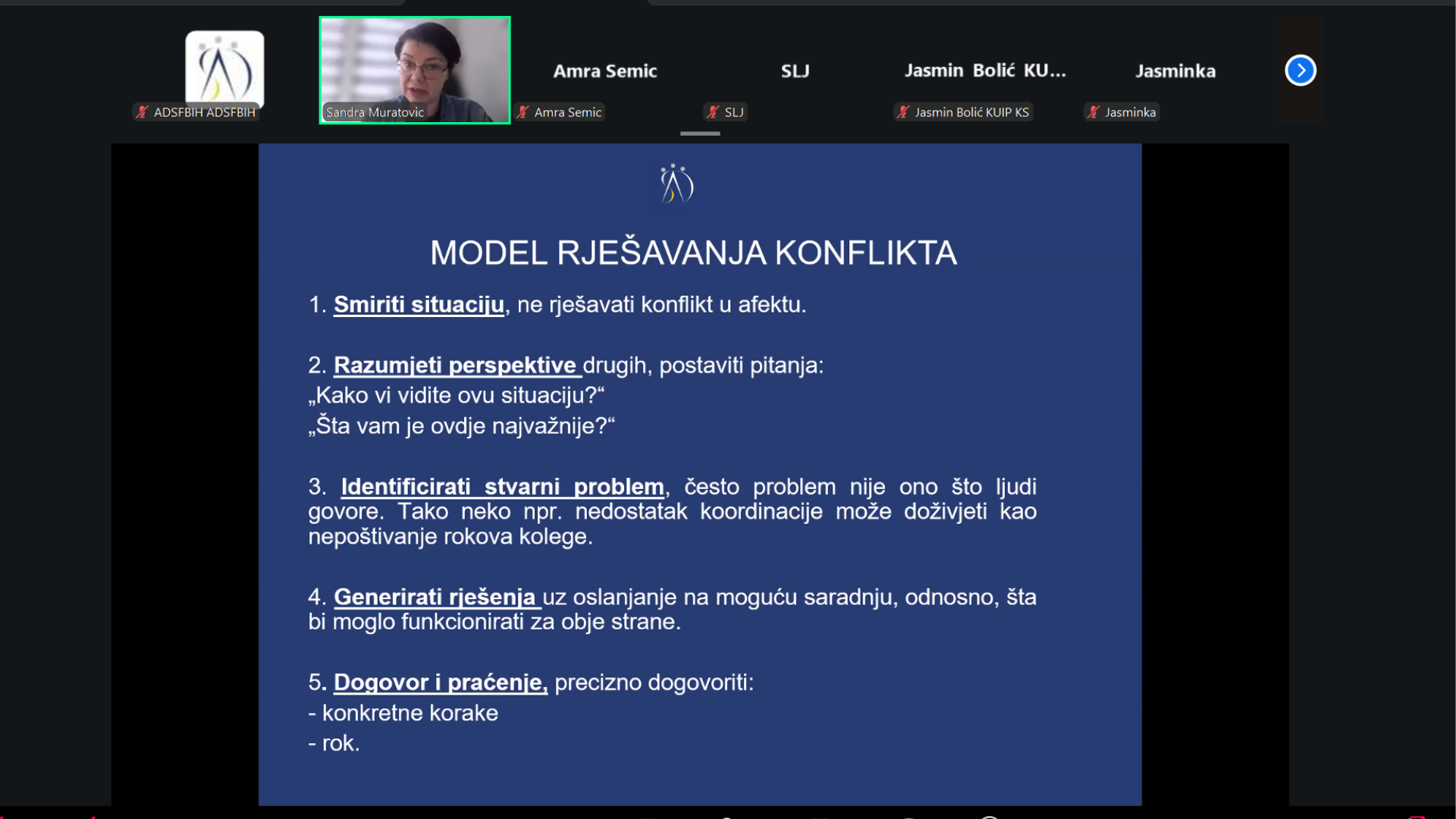 Tokom edukacije korištena je i opcija breakout rooms, gdje su učesnici bili raspoređeni u manje grupe od 7 do 8 članova. U tim grupama su analizirali konkretne scenarije konflikata, nakon čega je diskusija nastavljena u zajedničkoj sesiji, omogućavajući razmjenu zaključaka i različitih pristupa rješavanju konfliktnih situacija.