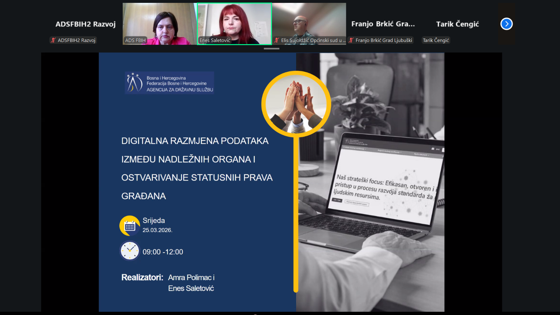 Dana 25.03.2026. godine u digitalnom okruženju održana je edukacija na temu „Digitalna razmjena podataka između nadležnih organa i ostvarivanje statusnih prava građana“, kojoj su prisustvovala ukupno 33 polaznika.