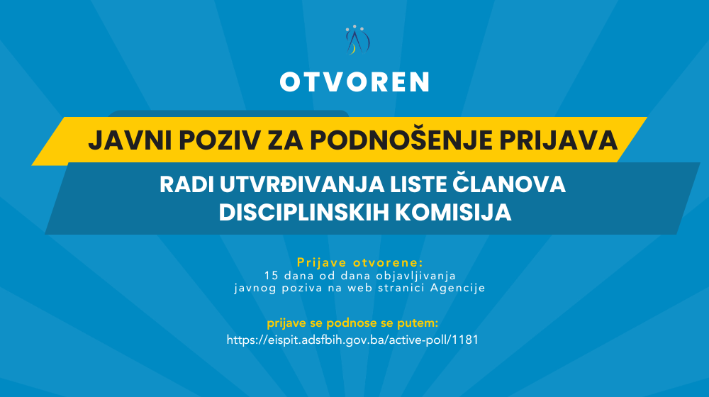 Agencija za državnu službu Federacije Bosne i Hercegovine objavila je Javni poziv za podnošenje prijava radi utvrđivanja Liste članova disciplinskih komisija.