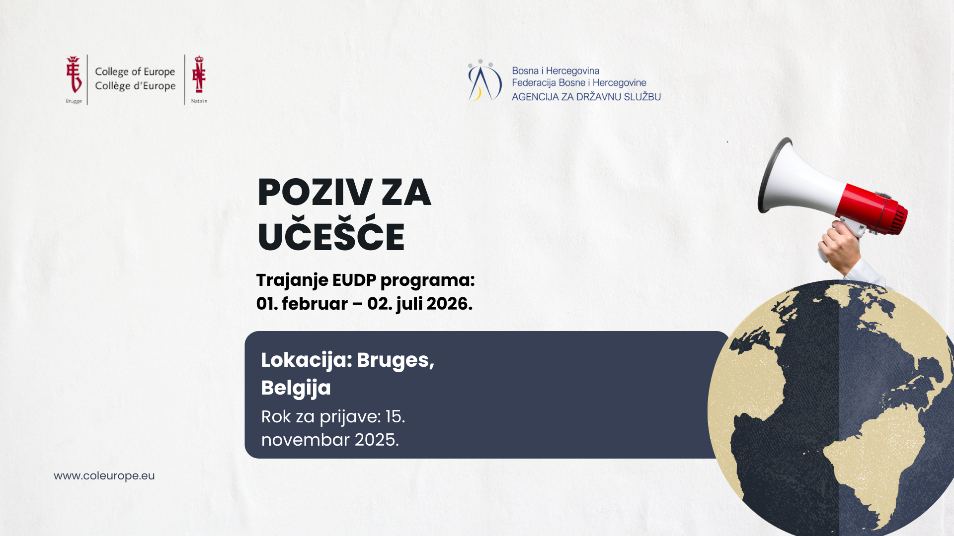 Za tačne informacije o načinu prijave i potrebnoj dokumentaciji, kontaktirajte svoje nadležno ministarstvo ili posjetite: www.coleurope.eu