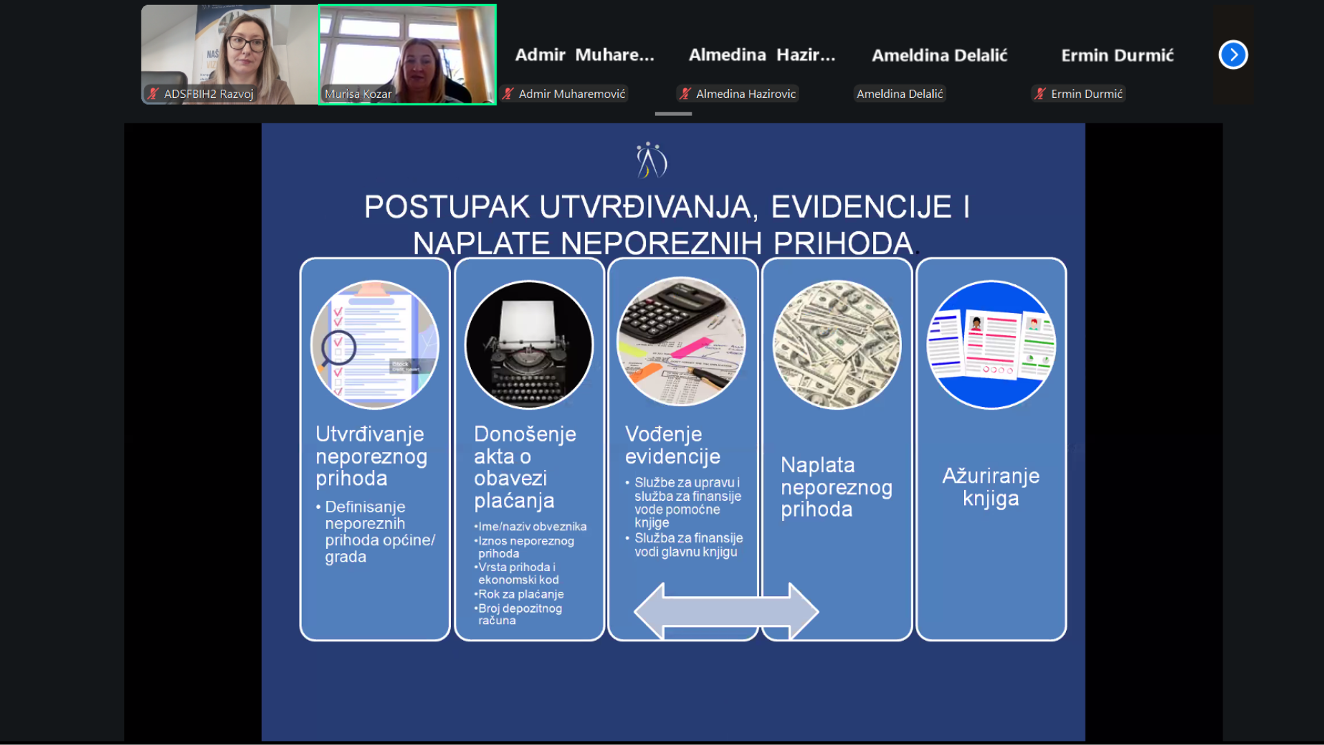 Tokom edukacije učesnici su imali priliku da se upoznaju sa propisanim postupcima evidentiranja, kontrole i naplate neporeznih prihoda, kao i sa načinima praćenja i kontrole dospjelih potraživanja. Poseban fokus stavljen je na praktičnu primjenu pravilnika o neporeznim prihodima na lokalnom nivou, kao i na prepoznavanje izazova u procesu naplate i mogućnosti njihovog unapređenja.